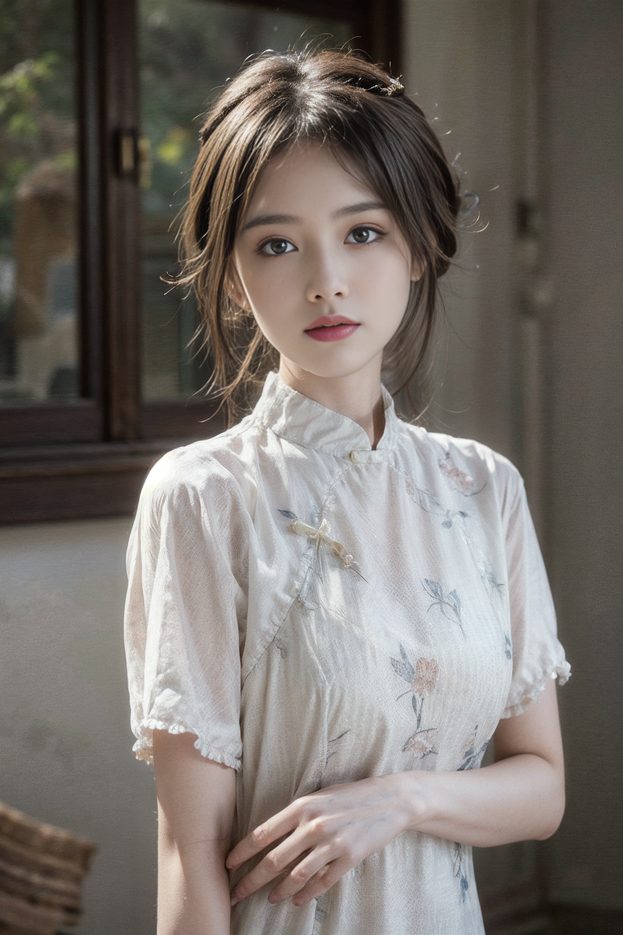 signature, jewelry,extremely detailed CG unity 8k wallpaper,masterpiece, best quality, ultra-detailed, beautiful detailed eyes:1.2,best illumination, (best shadow, an extremely delicate and beautiful, bloom),(masterpiece:1,2), best quality, masterpiece, highres, original, extremely detailed wallpaper, perfect lighting,(extremely detailed CG:1.2), drawing, paintbrush,<lora:qipaoxiezhen:0.7>,<lora:ç»èè°æ´ add_detail:0.8> <lora:åå ´ MengX girl_Mix_V40:0.8>