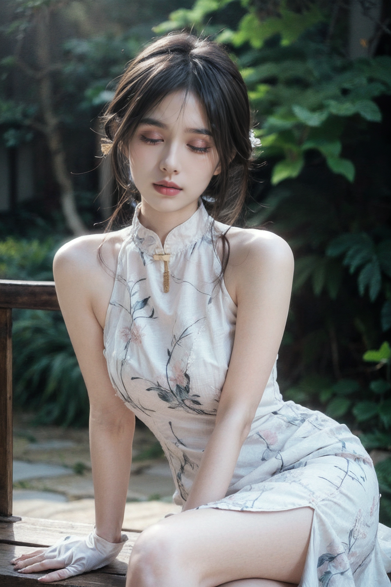 1girl, blurry, sitting, blurry_background, tree, solo, dress, bracelet, jewelry, day, white_dress, closed_eyes, brown_hair, gloves, depth_of_field, white_gloves, lips, bare_shoulders,extremely detailed CG unity 8k wallpaper,masterpiece, best quality, ultra-detailed, beautiful detailed eyes:1.2,best illumination, (best shadow, an extremely delicate and beautiful, bloom),(masterpiece:1,2), best quality, masterpiece, highres, original, extremely detailed wallpaper, perfect lighting,(extremely detailed CG:1.2), drawing, paintbrush,<lora:qipaoxiezhen:0.7>,<lora:细节调整 add_detail:0.8> <lora:孟兴 MengX girl_Mix_V40:0.8>