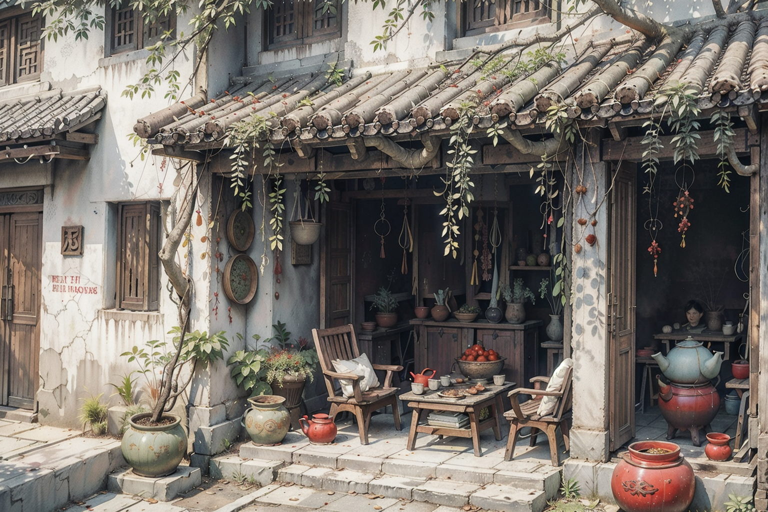 best quality,masterpiece,dynamic angle,highest detailed,(clearness:1.3) chinese watercolor painting Green plants, potted plants, eggplants, red chili peppers, under eaves, windows, fallen leaves, hanging baskets, teapots, stoves for lighting fires