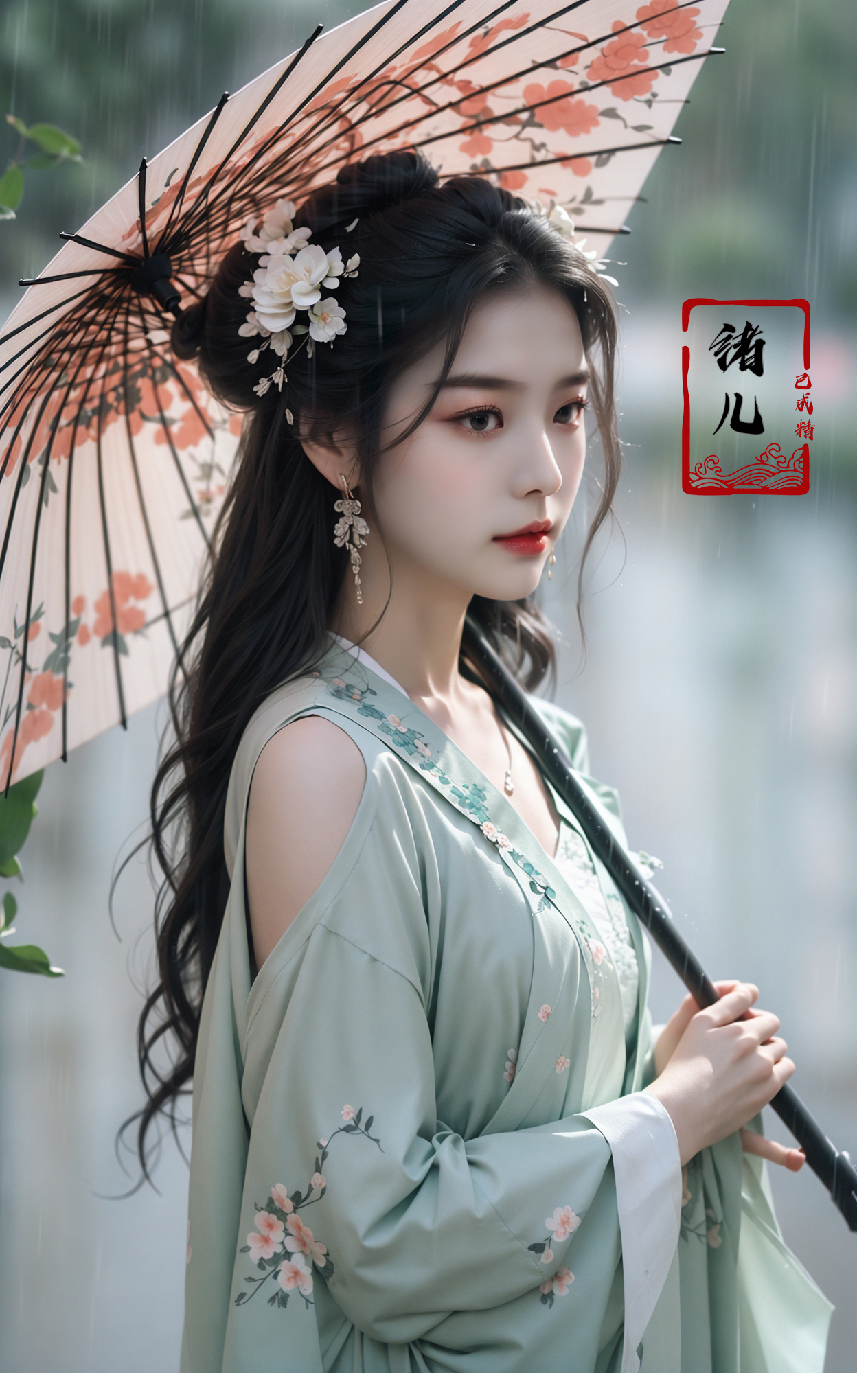 A woman holds a oil-paper umbrella on her shoulder to shelter from the rain as part of a fashion event in the style of Yue Xiaofei, light jade, ethereal dream, Tang Youhong, elegant, detailed design, dansaekhwa Joil-paper umbrellachinese clothesholding umbrellarain <lora:~Q?-ON-Noil paper umbrella:0.9>