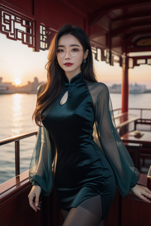 ltra-detailed,highly detailed,best quality,masterpiece,illustration,realistic,photorealistic, whqp, qipao, solo, 1girl, green dress,green sleeves, crossdressing, chinese clothes, china dress, see-through sleeves, long sleeves, cleavage cutout, pantyhose, round eyewear, side slit, long hair, bangs, looking at viewer,cowboy shot, outdoors, sea,cruise ship, ship deck, skyline, sunlight, sunrise, <lora:whqp qipao_v1_03:0.7>