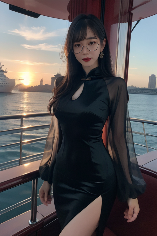 ltra-detailed,highly detailed,best quality,masterpiece,illustration,realistic,photorealistic, whqp, qipao, solo, 1girl, green dress,green sleeves, crossdressing, chinese clothes, china dress, see-through sleeves, long sleeves, cleavage cutout, pantyhose, round eyewear, side slit, long hair, bangs, looking at viewer,cowboy shot, outdoors, sea,cruise ship, ship deck, skyline, sunlight, sunrise, <lora:whqp qipao_v1_03:0.7>