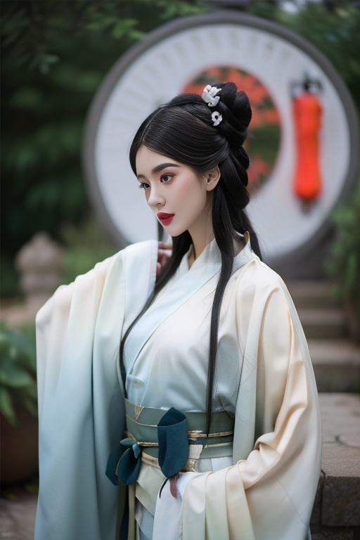 ltra-detailed,highly detailed,best quality,masterpiece,illustration,realistic,photorealistic, 1girl, solo, hanfu-quju, hanfu, chinese clothes, chinese traditional clothes, long sleeves, wide sleeves, sash, jewelry, hair ornament, hairpin, very long hair, hair bun, parted bangs, looking at viewer, upper body, ceremony, outdoors, photo background, stairs, day, tree, <lora:hanfu quju_v1_07:1.0>
