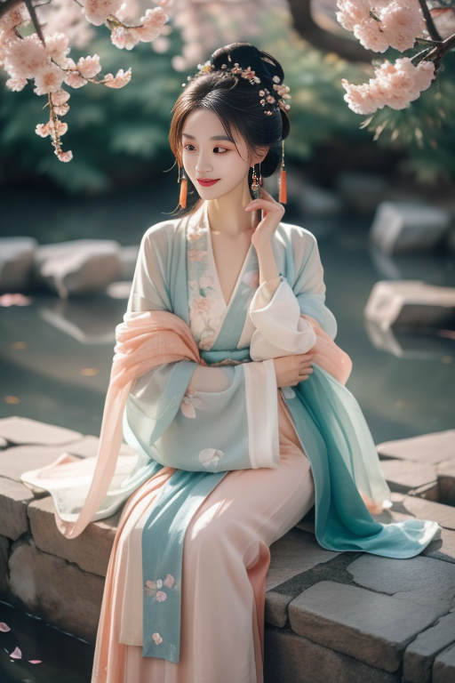 ltra-detailed,highly detailed,best quality,masterpiece,illustration,realistic,photorealistic, 1girl, solo, 24yo chinese female, hanfu-song, hanfu, song theme, chinese clothes, multicolored dress, jewelry, flower earrings, hair ornament, necklace, hair flower, long hair, single hair bun, updo, hair up, looking at viewer, light smile, full body, sitting on rock, adjusting hair, flower, photo background, outdoors, butterfly, tree, peach blossom, wind, falling petals, <lora:hanfu song_v1_03:0.9>