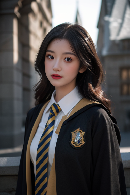 ltra-detailed,highly detailed,best quality,masterpiece,illustration,realistic,photorealistic, 1girl, solo, hufflepuff uniform, hogwarts school uniform, robe, collared shirt, necktie, looking at viewer, <lora:hufflepuff uniform_v1_06:0.7>