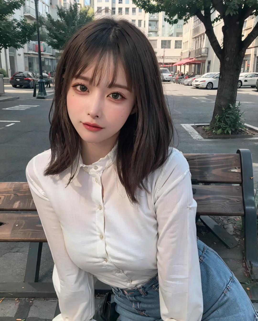 best quality, photorealistic, 8k, high res, full color, 1girl, woman, 20 years old woman, (closed mouth:1.43), (skindentation), (portrait:0.6), trees, park bench, daylight, ((park background:1.52)), full color, ((whitebuttonedshirt:1.58)), looking at viewer:1.8, (1girl eyes looking at viewer:1.55), (medium hair, brownhair, partedbangs:1.45), (bokeh),<lora:AAV-unpai:0.69>