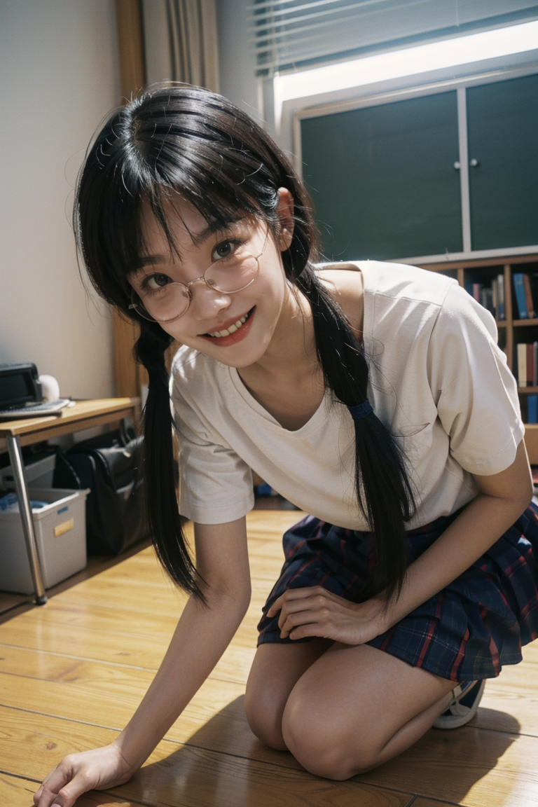 <lora:Lora_v20:0.7> A Chinese schoolgirl sitting in a classroom, kneeling on the floor, hiding under the desk. She is wearing glasses. Twintails. She is (shaking her head). She is in an open posture. She is slim, slender, petite, skinny. She is (winking) with a teasing smile, smirking, open mouth. professional lighting, soft light, Extremely detailed, raw photo, best quality, masterpiece, award-winning photography, huge filesize, 8k, highres,