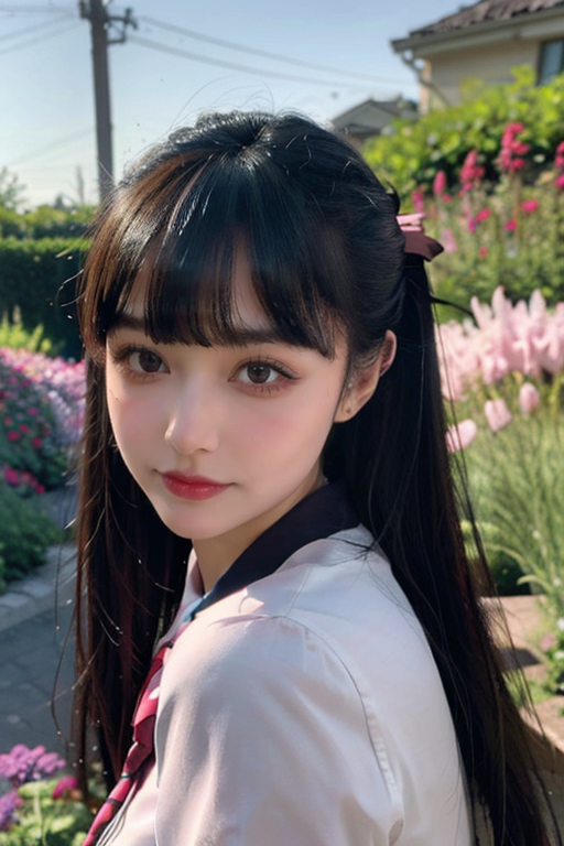 best quality,masterpiece,realistic,HDR,UHD,8K,Highly detailed,1girl,long hair,ponytail,radiant face,sparkling eyes,blush,school uniform,background flower garden,looking at viewer,<lora:ssgui:0.8>