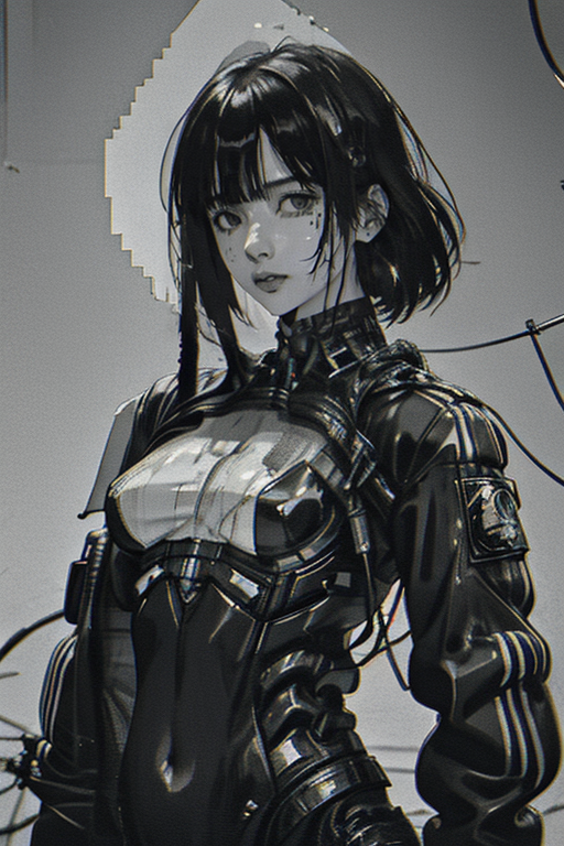 best quality,masterpiece,1girl, solo, monochrome, looking at viewer, gloves, breasts, greyscale, jacket, medium hair, upper body, cyberpunk, bangs,( chromatic aberration:1.3), hatching (texture), closed mouth, cable, bodysuit, wire, science fiction, <lora:XenotripStyle:1>