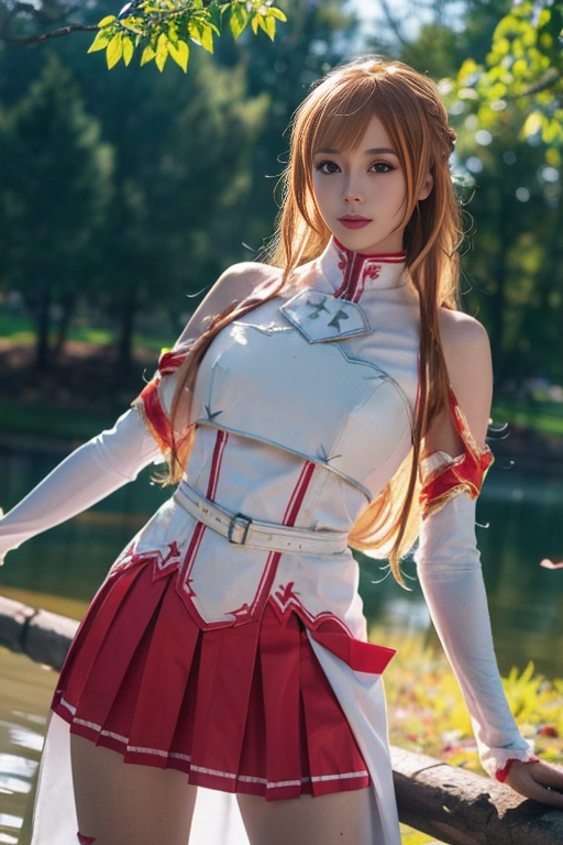 ltra-detailed,highly detailed,best quality,masterpiece,illustration,realistic,photorealistic, yuuki asuna, 1girl, solo, cosplay, breastplate, armor, skirt, bare shoulders, detached sleeves, gloves, belt, long hair, blonde hair, braid, bangs, cowboy shot, looking at viewer, outdoors, river,riverbank, water, grass, sky, falling petals, <lora:yuuki asuna_v3_06:0.8>