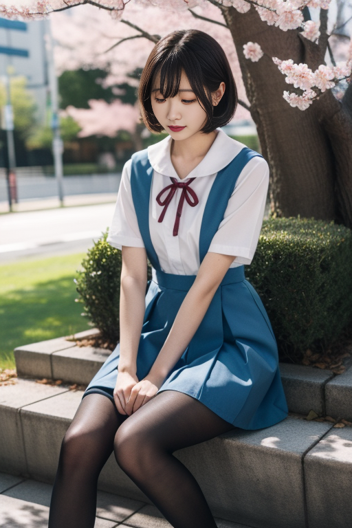 ultra-detailed,highly detailed,best quality,masterpiece,illustration,realistic, eva school unifrom, 1girl, solo, tokyo-3 middle school uniform, shirt, short sleeves, suspender skirt, neck ribbon,loafers, pantyhose, short hair, hime cut, sitting on stairs, v arms, outdoors, sky, day, blue sky,cosplay, cloud, wind,cherry blossoms, falling petals, <lora:eva school unifrom_v1_01:0.7>