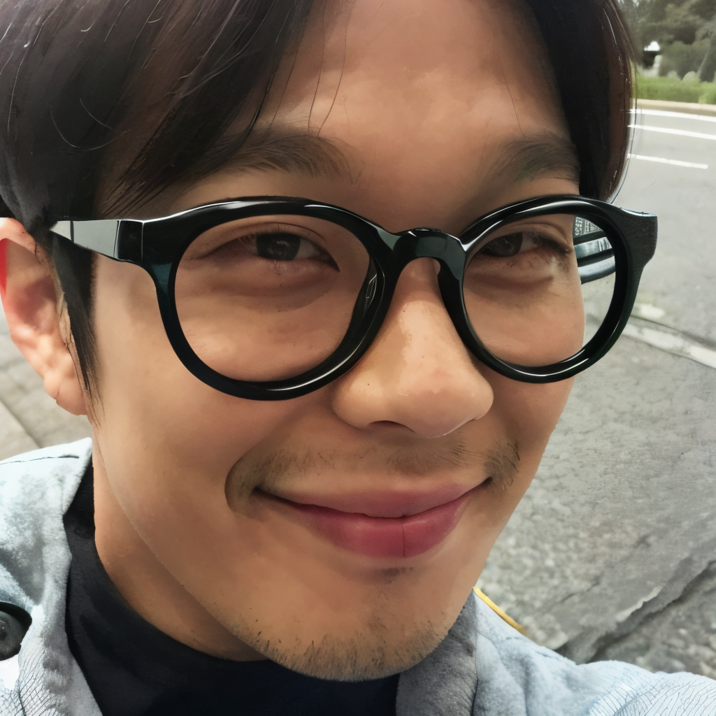 1boy , ,smile, solo, close-up, outdoors, <lora:Celebrity-haha_donghoon_v1:0.8>,glasses, haha, haroro