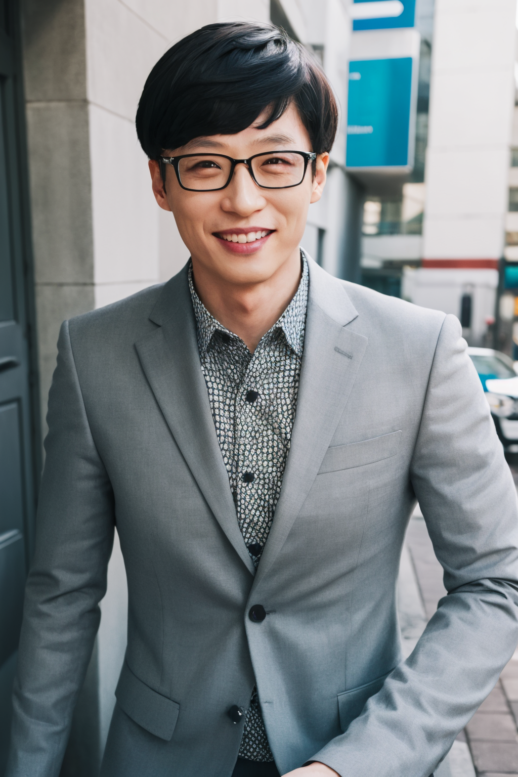 1boy ,smile, solo,upper body , outdoors, glasses, <lora:Celebrity-yu_jaeseok_v1:0.8>, jaeseok, indoor, suit, masterpiece, high quality, highres, realistic,