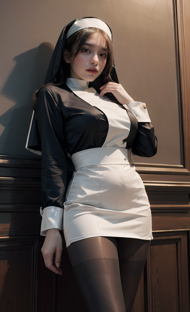 ultra detailed 8k cg, ((nun suit)),((sexy)),a very sexy woman in a miniskirt posing from below for a picture, ((from below:0.6)), fantasy style, in a majestic castle, medieval setting <lora:add_detail:0.4> ((black pantyhose)), <lora:AWPV2:0.9>
