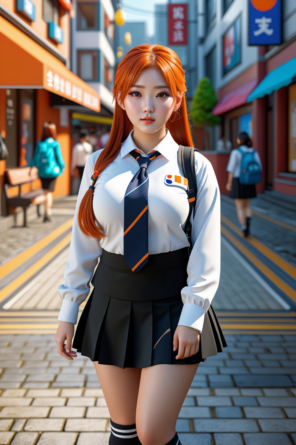 full body:1.4, 1girl, schoolgirl, beautiful, cute, beauty, korean, curvy, black and white uniform, orange hair, sexy, large breast, in the city center, detailed face, detailed eyes,(master piece, best quality, photo realistic, 8K, UHD, extreme detailed description, professional, studio lighting, sharp focus, natural lighting, highres, ultra realistic 8K CG, perfect lighting, exremely detailed background, ultra realistic, vivid colors, soft HDR), emphasize realistic lighting, shadows, and textures to bring an authentic and immersive quality to the scene