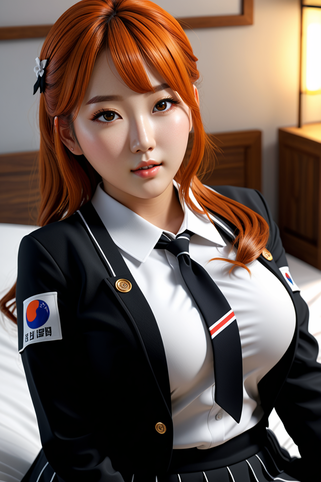 full body:1.4, 1girl, schoolgirl, beautiful, cute, beauty, korean, curvy, black and white uniform, orange hair, sexy, large breast, in bed, lying on back, detailed face, detailed eyes,(master piece, best quality, photo realistic, 8K, UHD, extreme detailed description, professional, studio lighting, sharp focus, natural lighting, highres, ultra realistic 8K CG, perfect lighting, exremely detailed background, ultra realistic, vivid colors, soft HDR), emphasize realistic lighting, shadows, and textures to bring an authentic and immersive quality to the scene