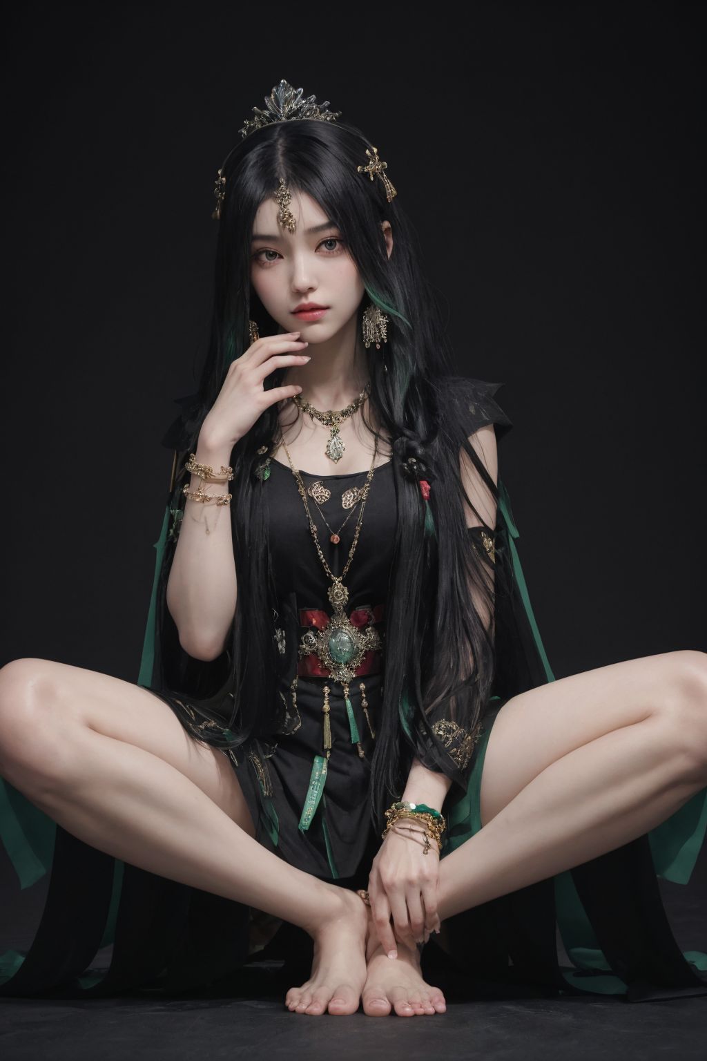<lora:Qu-Punishing Gray Raven:0.6>, qu,multicolored hair,black and green hair,long hair,hair ornament,tiara,chinese clothes,long sleeves,bracelet,necklace,ribbon,black footwear,side slit, high slit, thighs,cowboy shot, barefoot, gross-neg,spread legs,, (masterpiece, best quality, high quality, highres, ultra-detailed),