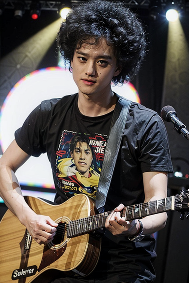 best quality, ultra high res, (photorealistic:1.4), masterpiece, Concert background,1boy,standing,On stage,Play the guitar,sing(looking at viewer), <lora:zhaoyingjun:0.8>