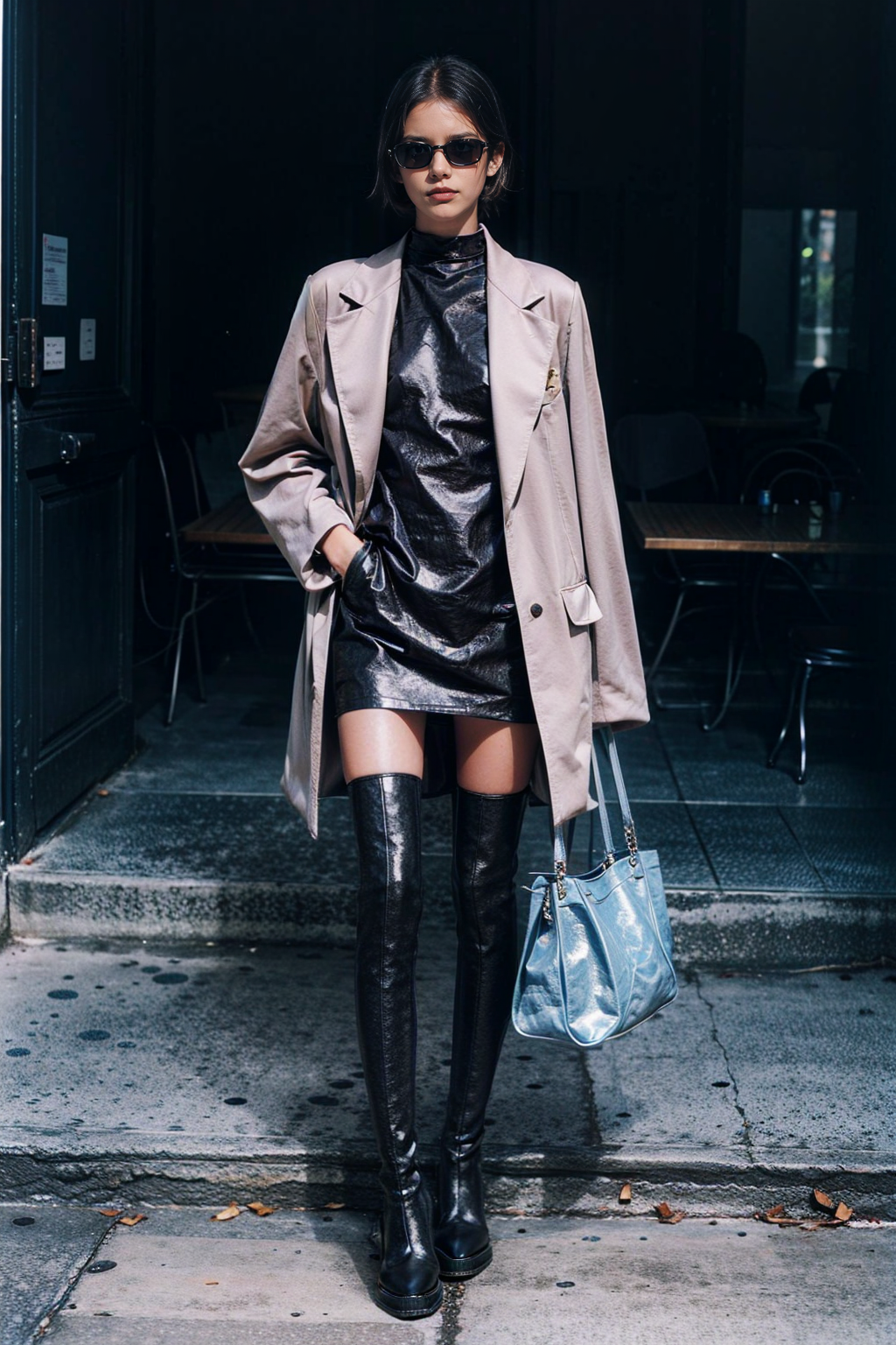 (1girl), young woman, with slim and skinny body, small breast, flat chest:1, Pure black concept photoshoot, ((best quality)), <lora:balenciaga_66160_lora_2:1> BALENCIAGA, Lambskin, mini dress, oversize coat <lora:add_detail:1>, on the street of new york, designer bag, black thighhigh