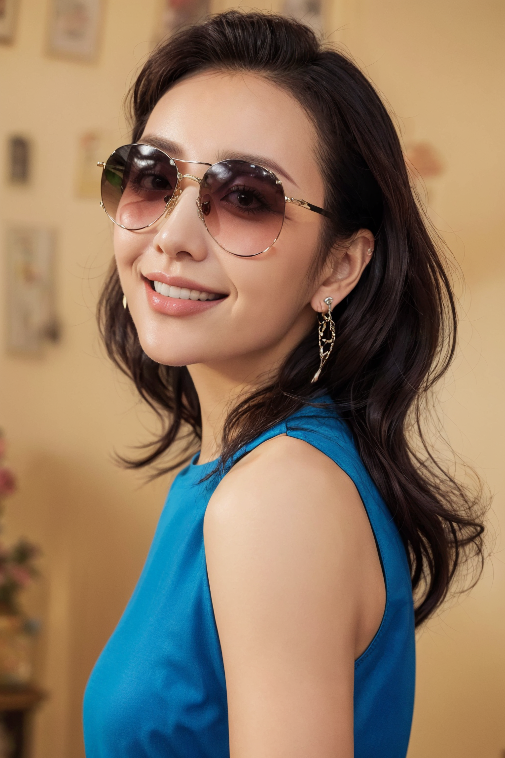 1girl, wangou, solo, fashion clothes, sleeveless, looking at viewer, smile, necklace, earrings, upper body, sunglasses, v, chinese background, masterpiece, high quality, highres, realistic, photorealistic,