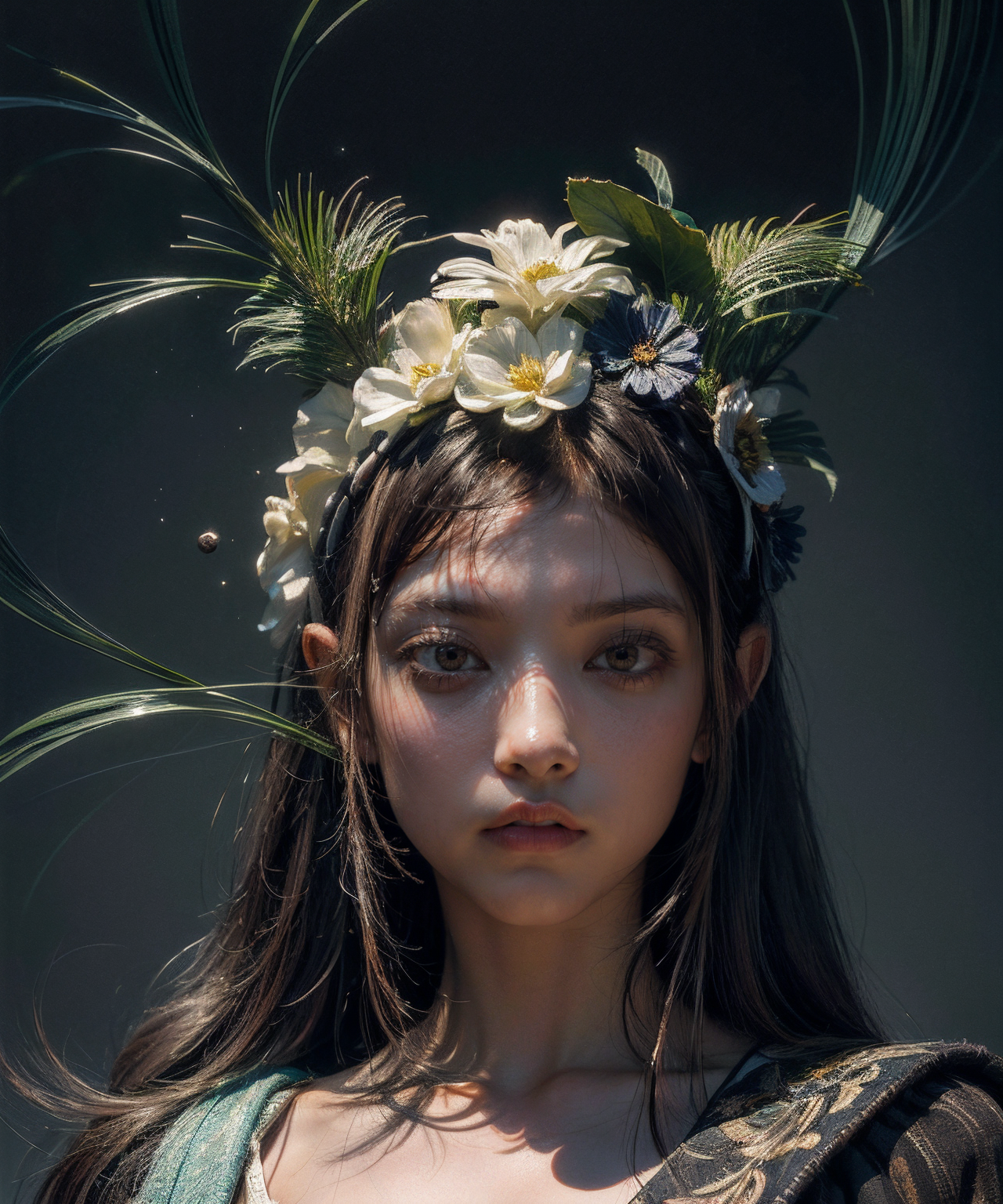 <lora:haerinnewjeanslora:1>, (masterpiece, top quality, best quality, official art, beautiful and aesthetic:1.2), (1girl), extreme detailed,(fractal art:1.1),highest detailed, splash of paint, head piece, elegant, detailed, simple background, ((elegant)), (fashion), beautiful, masterpiece, perfect composition, extra art, artistic, ingenious, perfect art, 8k, (intense: 2), flowers, (Dupatta), (cinematic), <lora:add_detail:0.8> , ((symetrical)), ((looking at viewer))