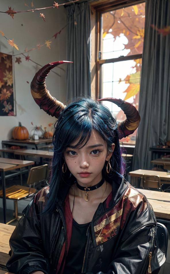 1 mermaid, (demon skull), tech, cyberpunk, wires, goggles, transparent layered jacket, (gold hair:1.2), lightbox, choker, earrings, (red stripe makeup:1.3), flower in hair, beautiful lighting, best quality, masterpiece, ultra highres, photorealistic, (autumn abstract background:1.4), <lora:Niji:0.5>, closeup, bokeh <lora:addDetail.JO09:0.8>