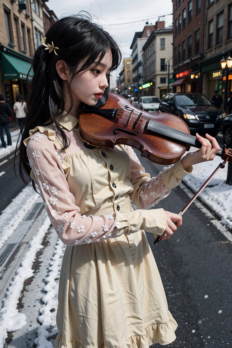1girl, playing violin, violin, bow \(music\), snow, on the street, black hair, best quality, 8k, masterpiece, <lora:violin_v12:0.67>
