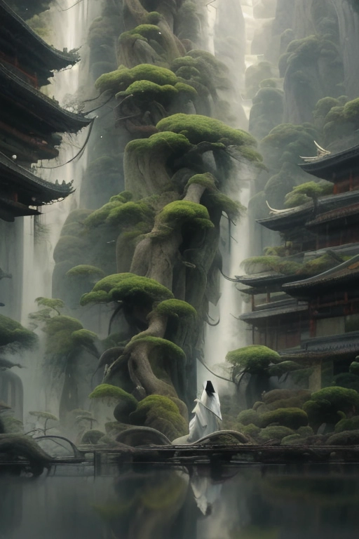 an painting in a style of oriental painting, in the style of matte painting, layered and atmospheric landscapes, rich and immersive, quiet contemplation, dark white and green, history painting, zen-inspired, grandeur of scale, highly detailed, dynamic, cinematic, stunning, realistic lighting and shading, vivid, vibrant, 8k, octane render, unreal engine, very detailed, concept art, realistic, Cry engine, wide shot, 1 girl, very long hair, white hair, (upper body:1.0), <lora:pine_20230904213617:1>, <lora:LowRA:0.4>, <lora:add_detail:1>