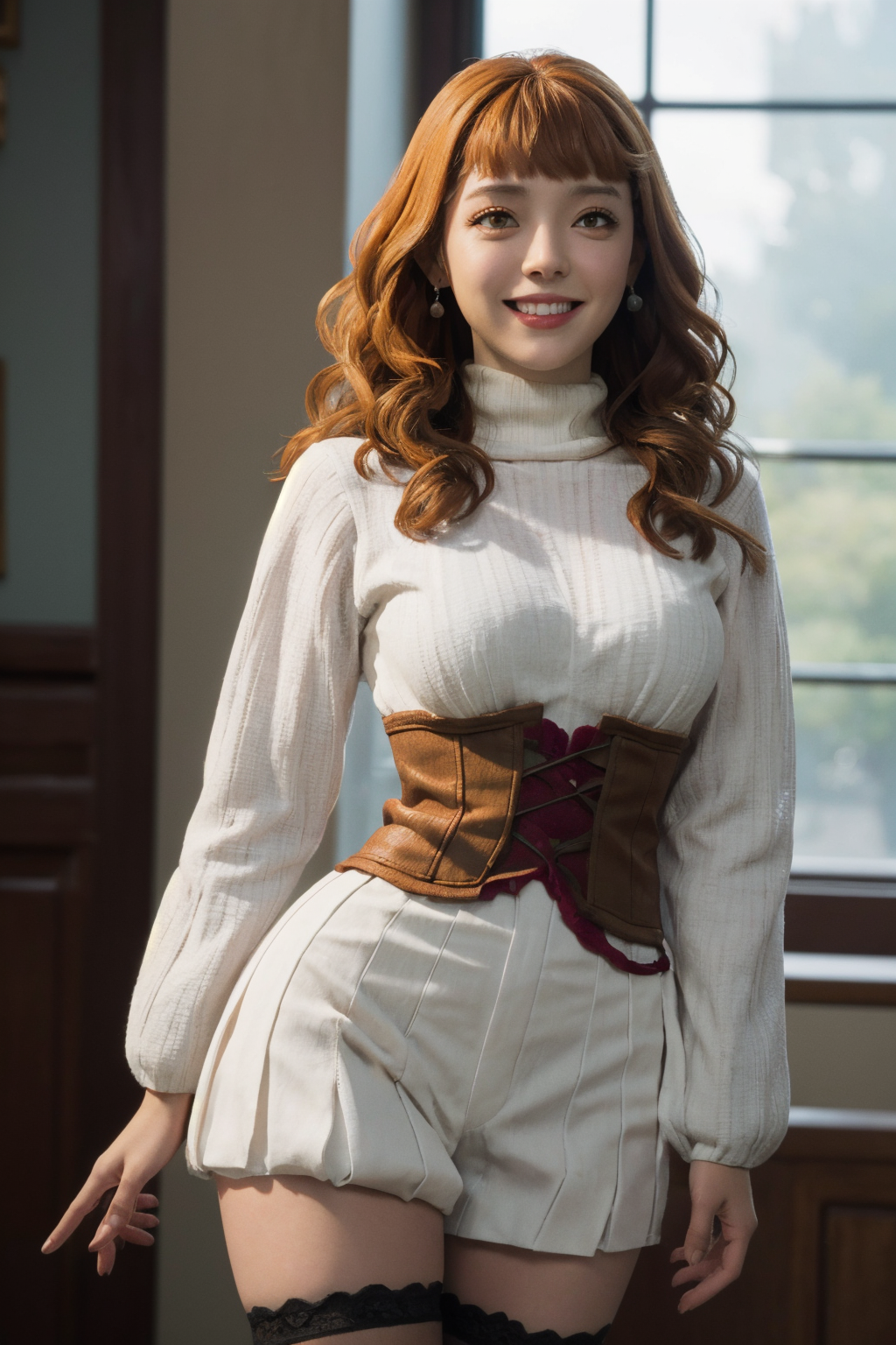 mimosa vermillion,orange hair, turtleneck sweater, corset, thighhighs, earrings, smile, looking at viewer, window, light smile, (intricately detailed, hyperdetailed), blurry background,depth of field, best quality, masterpiece, intricate details, tonemapping, sharp focus, hyper detailed, trending on Artstation,1 girl, high res,facing viewer, official art, <lora:mimosa:0.8>