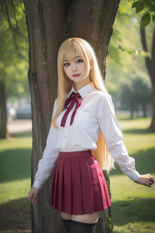 ultra-detailed,highly detailed,best quality,masterpiece,illustration, doma umaru, 1girl, solo, very long hair, parted bangs,blonde hair, school uniform, red neck ribbon,white collared shirt,long sleeves, red pleated skirt, black thighhighs, loafers, standing,looking at viewer, sunlight, flower, tree, nature, forest, wind,floating hair, <lora:doma umaru_v1_03:0.7>