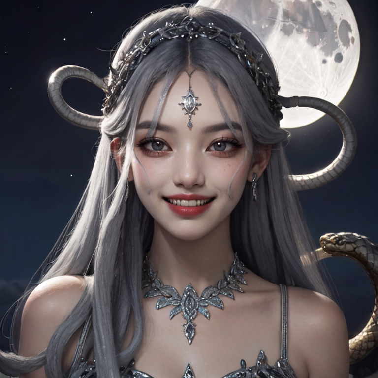 middle shot, outside, an exquisitely beautiful Medusa in intricate design precious dress, ([airy gleaming snake hair|stone grey color hair]), slim face, clear glowing eyes, long nose, evil grin, fangs, moon light, (OverallDetail:0.23), <lora:gorgon:0.75>