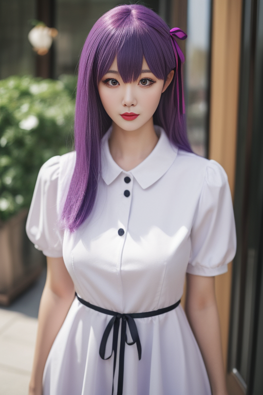 ultra-detailed,highly detailed,best quality,masterpiece,illustration,realistic, real,photo,photorealistic, matou sakura, 1girl, solo,cosplay, hair ribbon, long dress, collared dress,puffy short sleeves, ribbon, official alternate costume, purple hair, purple eyes, bangs, long hair, hair between eyes, photo background, blurry,looking at viewer, blurry background, depth of field,east asian architecture, courtyard, <lora:matou sakura_bq_v1_01:0.7>