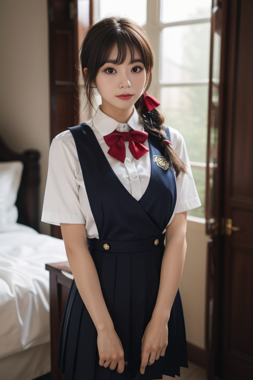 ultra-detailed,highly detailed,best quality,masterpiece,illustration,realistic, school uniform, solo, 1girl, red dress,hair ribbon,collared shirt, pinafore dress, pleated skirt, long skirt, short sleeves, bowtie, badge, standing,looking at viewer, \m/,cowboy shot, huge breasts, side ponytail, very long hair, hair hair over shoulder, brown hair, bangs, blurry background, photo background,indoors, bedroom, <lora:school uniform__hnq_v1_05:0.7>