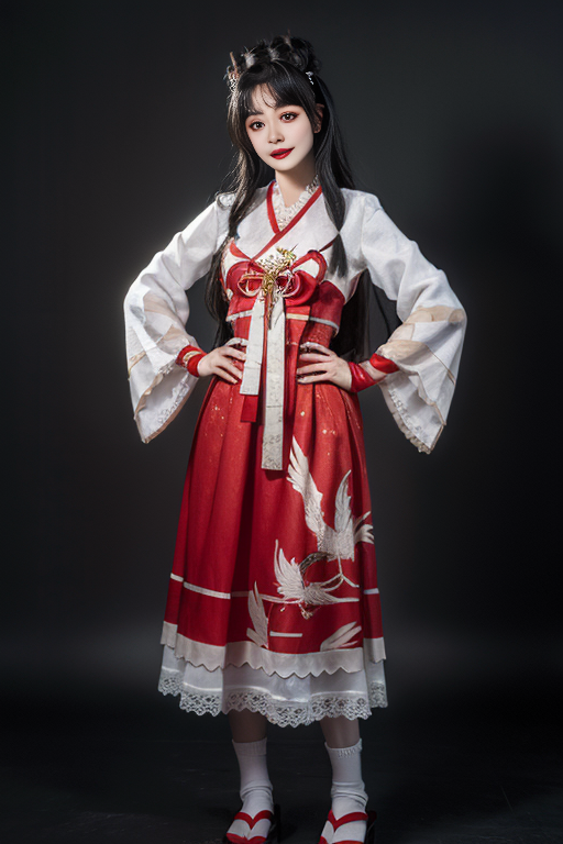 ultra-detailed,highly detailed,best quality,masterpiece,illustration,realistic, hutao, 1girl, black hair, solo, lotus, flower, long hair, korean clothes, full body, socks, water, hands on hips, standing, lily pad, long sleeves, dress, white socks, ribbon, hanbok, realistic, skirt, traditional clothes, looking at viewer, smile, brown eyes, sandals, wide sleeves, chinese clothes, black eyes, red ribbon, red skirt, animal print, parted lips, lips, signature, grey background, see-through, bangs, tdnm <lora:hutao_tdnm_v2_03:0.8>