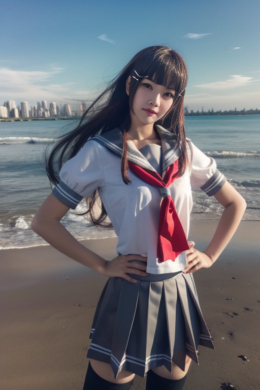 ltra-detailed,highly detailed,best quality,masterpiece,illustration,realistic,photorealistic, llas, cosplay, 1girl, solo, school uniform, serafuku, sailor collar, short sleeves, red neckerchief, pleated skirt,thighhighs, long hair, bangs,hair ornament, looking at viewer, hands on hips, head tilt, cowboy shot, photo background, beach,sea,waves, skyline, <lora:llas_v1_05:0.9>