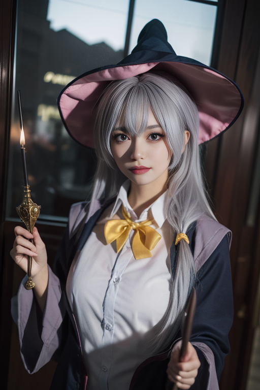ltra-detailed,highly detailed,best quality,masterpiece,illustration,realistic,photorealistic, elaina, witch, wizard, elaina \(majo no tabitabi\), cosplay, 1girl, solo, open robe, collared shirt, long sleeves, wide sleeves, bowtie, jewelry, badge, long hair, bangs, hair between eyes, grey hair, hair ribbon, hair bow,ahoge, holding wand, looking at viewer,upper body, <lora:elaina_v1_06:0.7>