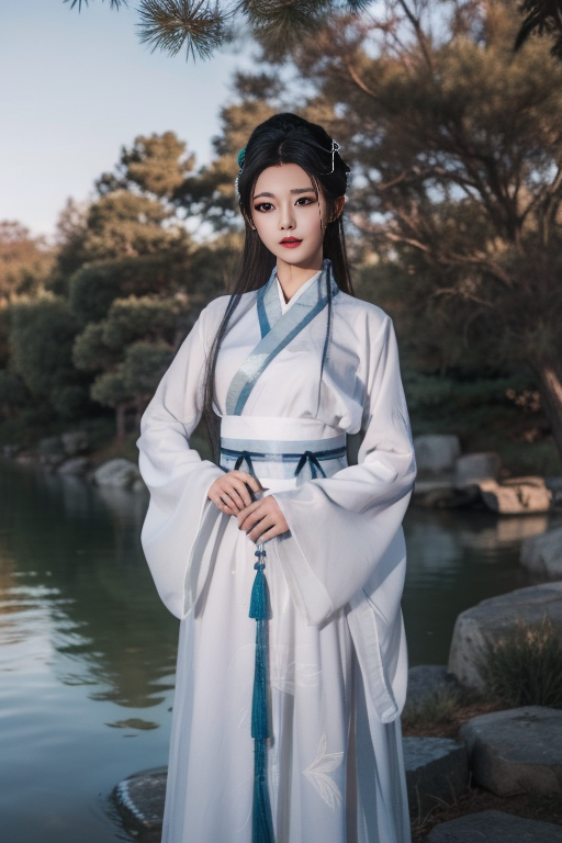 ltra-detailed,highly detailed,best quality,masterpiece,illustration,realistic,photorealistic, 1girl, solo, xiaobai, hanfu, chinese clothes, wide sleeves, long sleeves, see-through, sash, jewelry, tassel, hair ornament, long hair, looking at viewer, standing, cowboy shot, outdoors, tree, rock, day, photo background, sunlight, scenery, nature, water, <lora:xiaobai_v1_07:0.8>