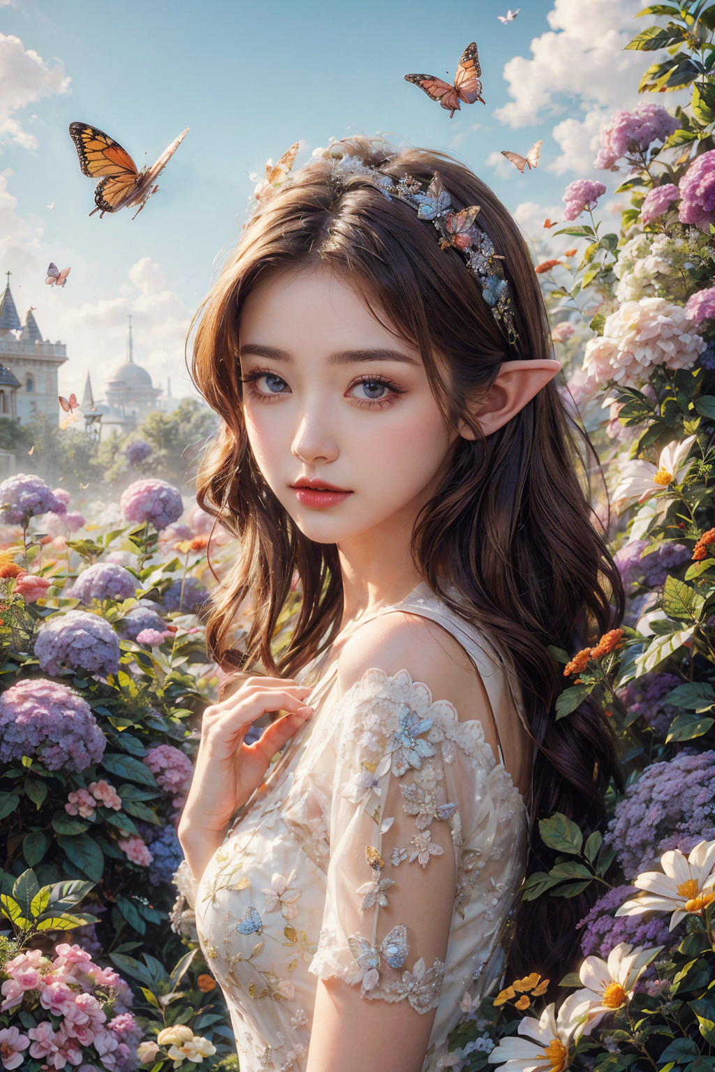 1girl, solo, brown hair, long hair, dress, butterfly hair ornament, animal, blue butterfly, blue flower, bouquet, butterfly, cloud, day, dragonfly, eyelashes, field, flower, flower field, garden, leaf, lily \(flower\), mountain, outdoors, pink flower, pointy ears, purple flower, purple rose, rose, sky, tulip, upper body, white butterfly, white flower, white rose, yellow butterfly, yellow flower,