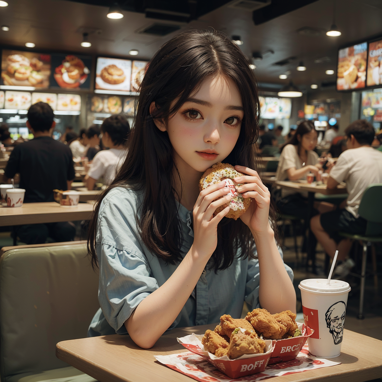 kendeji,food,a woman sitting at a table eating a doughnut and a cup of coffee in front of her and a tray of fried chicken, Best quality,masterpiece,ultra high res,<lora:è¯å¾·åº v2:0.6>,