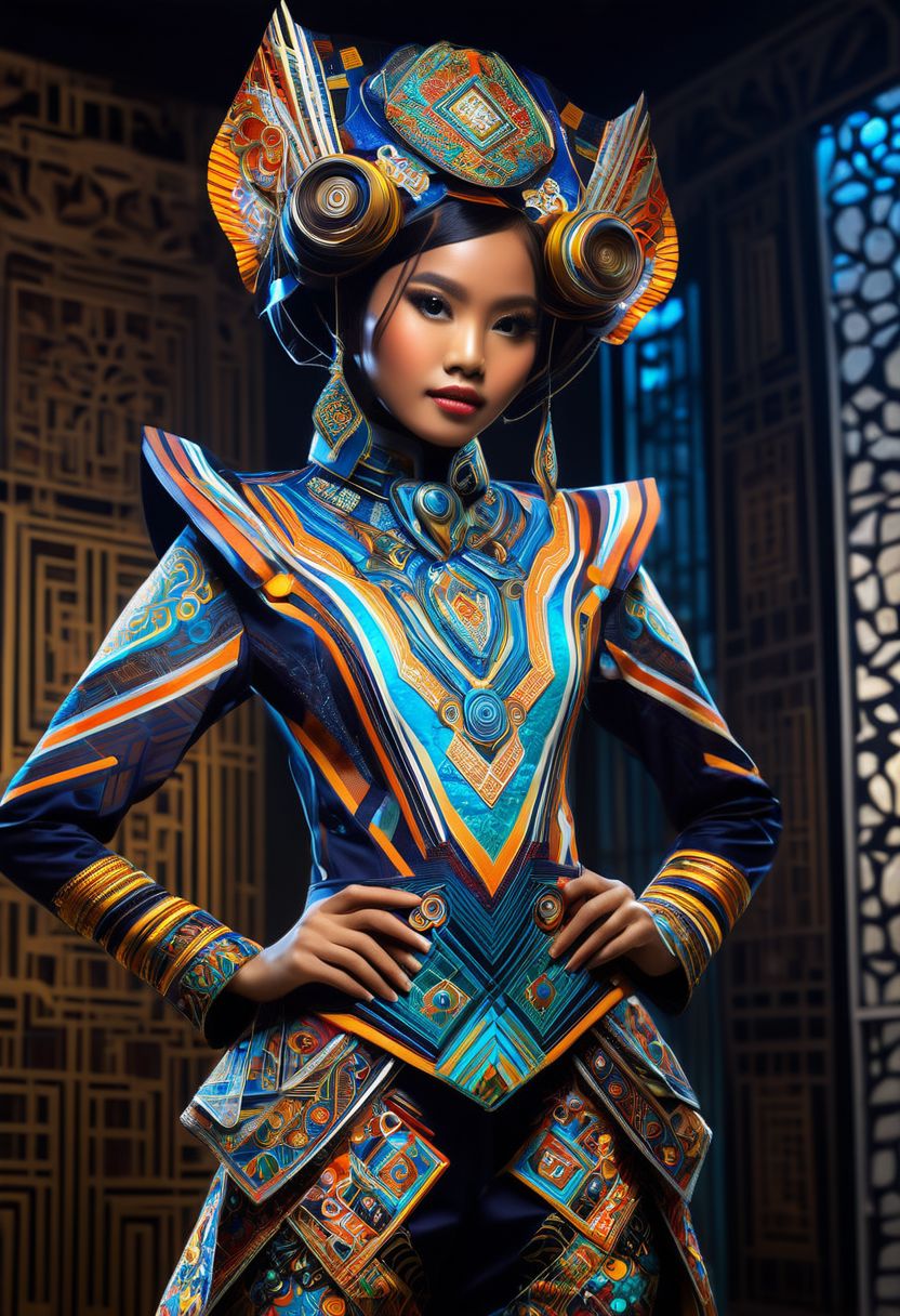 An Indonesian-styled futuristic suit worn by a girl depicting cultural fusion and modern fashion. The suit is adorned with intricate patterns and vibrant colors, showcasing the rich heritage of Indonesia. The girl stands confidently in a dynamic pose, with her detailed eyes reflecting determination and curiosity. The suit's material is a combination of traditional textiles and futuristic synthetic fabrics, giving it a unique and avant-garde appearance. The overall image quality is of the highest standard, with sharp focus and ultra-detailed rendering. The artwork employs physically-based rendering techniques, resulting in realistic lighting and shadows. The colors are vivid and vibrant, capturing the essence of Indonesian cultural aesthetics. The background features a fusion of modern architecture and traditional elements, creating a harmonious blend of the past and the future. The prompt explores the intersection of Indonesian culture, futuristic design, and the artistic representation of a confident girl