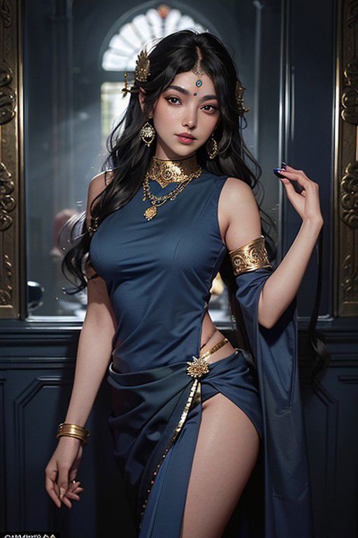 Very attractive,seductive stare,long black wavy hair,((blueberry skin tone)) (((a woman with dark Blue skin, hindu goddess))) . Wearing Silver saree dress,gold jewelry, sexy pose,sexy pose for a photo shoot, hourglass body, luscious lips,hindu temple
