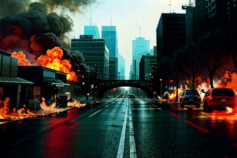 RAW photo, masterpiece, 8k, high quality, high resolution, sharp focus, extremely detailed, high perspective, a street in the demon realm, wrecked cars, fire, explosions, litter, toxic waste spill