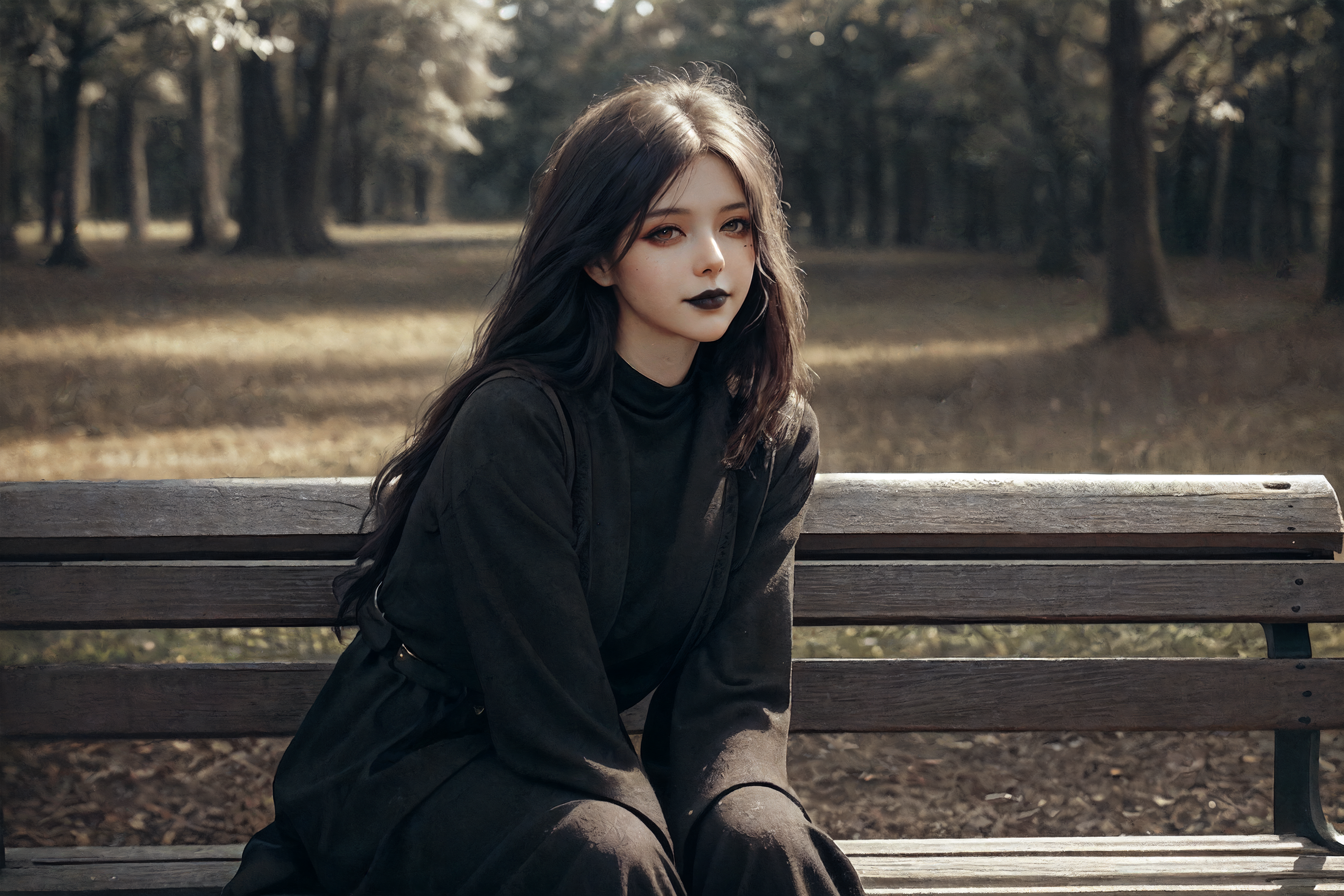 vintage photograph, a goth girl sitting on a bench, looking at viewer, light smile, black outfit, black hair, long hair, black lipstick, eyeliner, beautiful face, (soft sepia tones:1.2), nostalgic atmosphere, (worn-out edges:1.3), classic elegance, (gentle sunlight:1.2), serene park setting, (classic bench design:1.2), natural pose, (delicate vintage textures:1.3), highly detailed, atmospheric, (subtle film grain:1.1), (gentle breeze:1.2), (gentle shadows:1.2), vintage portrait, captivating simplicity, digital photography excellence