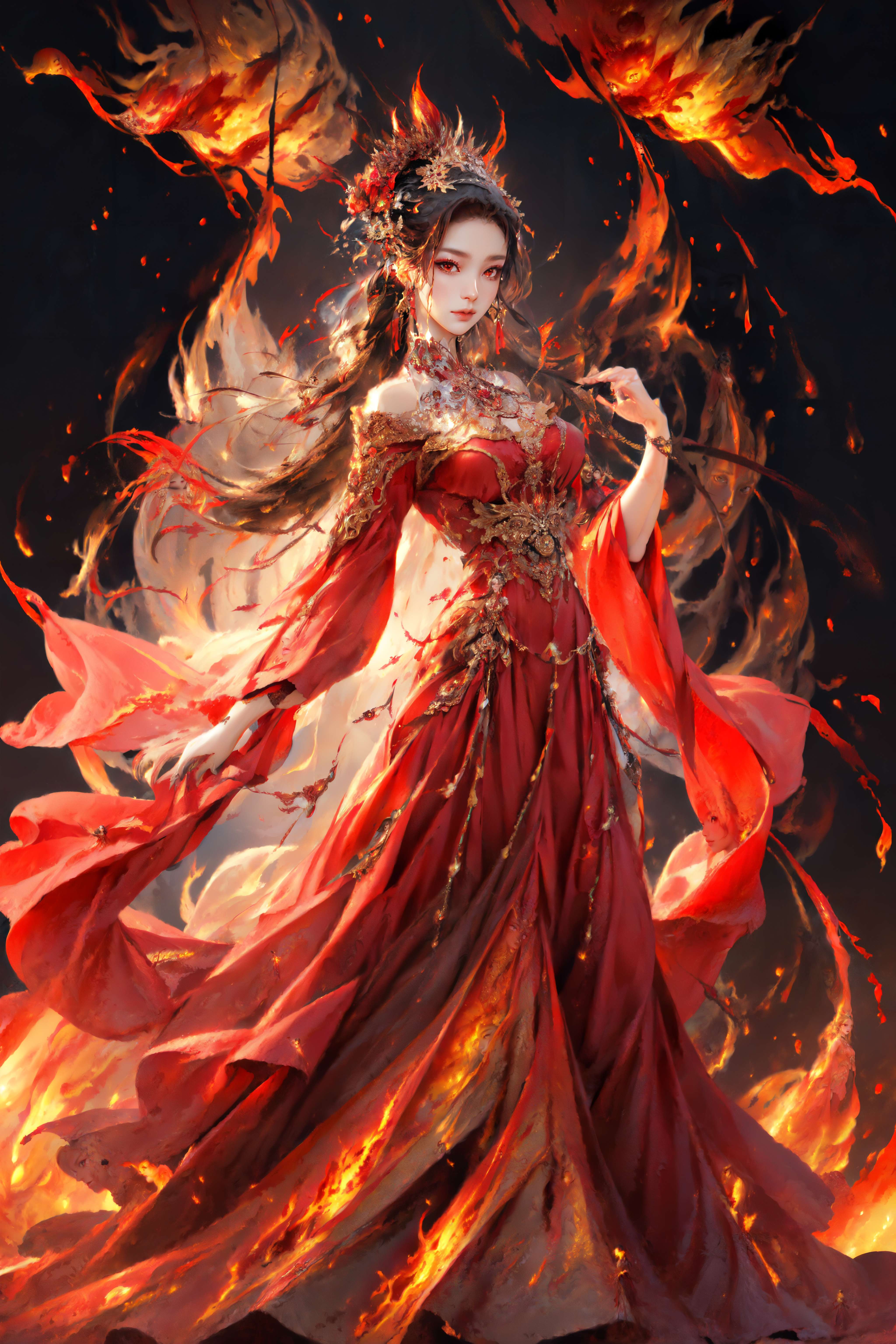 full body, (masterpiece), (ultra high quality), (intricate details), (digital art), 1girl, <lora:æ°¸ä¸ä¸¨å¤å éå¸_v1.0:0.8>, beautiful face, looking at viewer, dynamic composition, fire, (((flames))), volcano, ash, detailed eyes, vibrant colors, delicate dress, fire particles, best quality