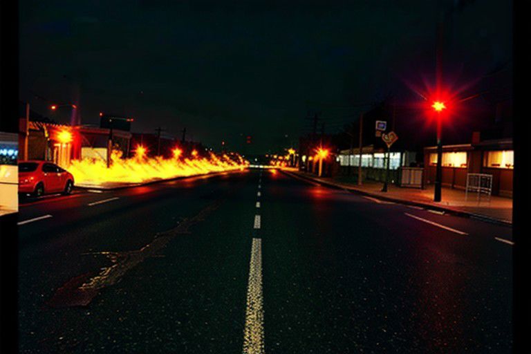 RAW photo, masterpiece, 8k, high quality, high resolution, sharp focus, extremely detailed, high perspective, a street in the demon realm, dark night, sodium lights, wrecked cars, fire, explosions, litter, toxic waste spill