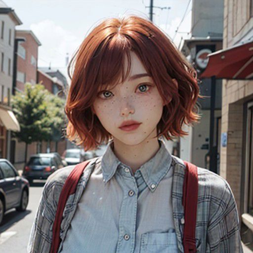 Redhead girl with asymmetrical haircut, short hair longer on left side, freckles, plaid flannel shirt