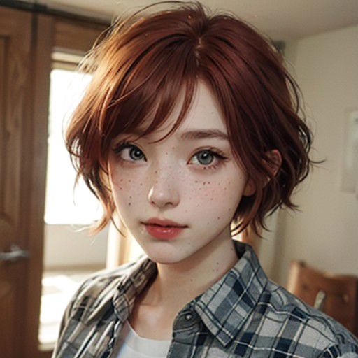 Redhead girl with asymmetrical short hair freckles, plaid flannel shirt