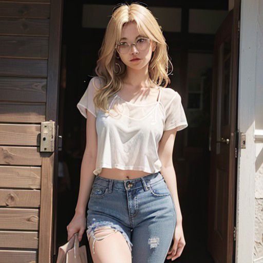 Nice legs, Daisy Dukes Low cut, see-through shirts Tight jeans, double D's blonde, glasses