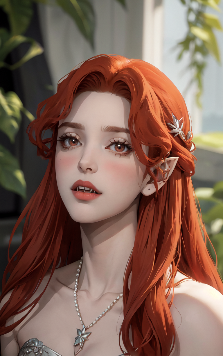((masterpiece, best quality)), insaneres, absurdres, solo, looking at viewer, NightGown_Lenore_ownwaifu, 1girl, long hair, red hair, red eyes, pointy ears, blush, breasts, cleavage, lips, red lips, collarbone, fangs, lipstick, makeup, vampire, braid, floating hair, jewelry, necklace, pearl necklace, armlet, grey dress, bare shoulders, (portrait, straight-on)<lora:CARTOON_Castlevania_Lenore_ownwaifu:0.8>, depth of field, vanishing point, garden, sidelighting,