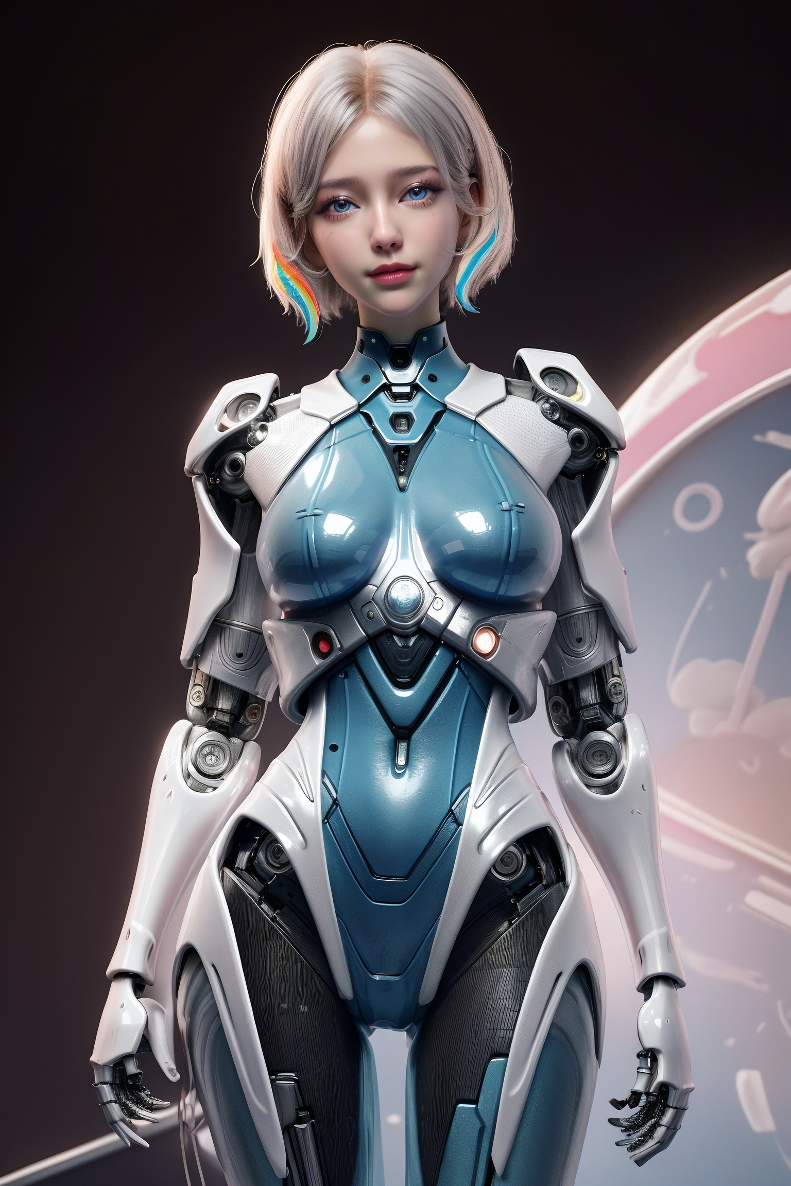 complex 3d render, octane render, ultra detailed, masterpiece, luxurious cyberpunk, hyperrealistic, anatomical, absurdres, highres, 8k, CG ,unity ,wallpaper, (realistic, photo-realistic:1.37),Amazing, finely detailed, best quality,official art, extremely detailed CG, cool silver.\\ 1bionic girl, cute, beauty, (cyborg:1.2), (porcelain skin:1.5),lights and robotic parts, cable electric wires, microchip, (colorful:1.5), vibrant details, detailed skin.\\ perfect body, perfect face, (large breasts:1.5),alternate hairstyle, slim fit, alternate hair color, detailed thick wiry hairline, Symmetrical facial features,(detailed face and eyes:1.2).\\ (tight smooth skin:1.5), (porcelain Bodysuit:1.5), face focus, petite, facing viewer, (cowboy shot:1.5),looking at viewer, (smile:0.5), staring, hazy gaze, squinting eyes, lascivious expression, elegant,.\\ <lora:real_slider_v2:-5> <lora:3DMM_V12:0.4> <lora:hipoly_3dcg_v7-epoch:0.8> <lora:epiCRealismHelper:0.5> <lora:addDetail.JO09:0.5> <lora:oil2.0_2-512-64:0.5> <lora:CyberPunkAI:0.2>